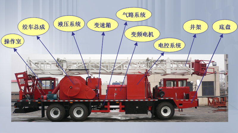 | 动力系统采用变频调速技术,主动力为变频调速电机,能够实现速度无极控制;主刹车采用液压盘式刹车,提高了修井机的安全性和可靠性;辅助刹车采用电机能耗制动和电机“悬停”,实现快速、平稳起放;采用数字化控制技术,以PLC控制技术为核心,实现数控、电控、气控一体化设计。 | 作业过程中,将变频电机控制开关推到上提或下放位置,大钩以最低速度运动,利用腿踏板实现加速,操作简便,工作效率高,提升力强,起下速度快,作业能力优于传统的通井机和修井机。工作效率比传统修井机工作效率高10%左右。 |